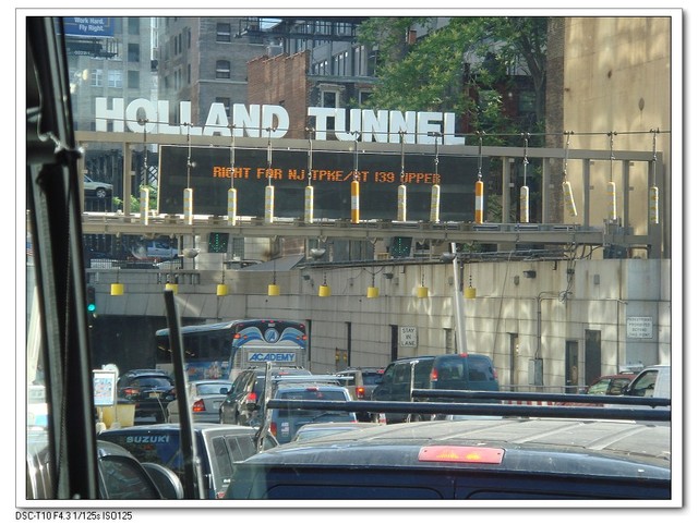 導遊開始介紹行程,剛開始還用三種語言解講呢!廣東話,普通話和英文,整台車上還有兩個印度人,所以不得不再用英文說明,沿路上的景點亦是,講的我們都覺得快打結了!我們車子經過荷蘭隧道Holland Tunnel到紐澤西州,紐約有兩條隧道通往紐澤西州的澤西市,一條是林肯隧道,另一條就是荷蘭隧道,這是一條使用通氣塔設計的隧道,席維斯史特龍的電影十萬火急Daylight就是以此為背景拍攝的!不過聽說拍攝的地點卻是位在34街的林肯隧道,呵呵~~