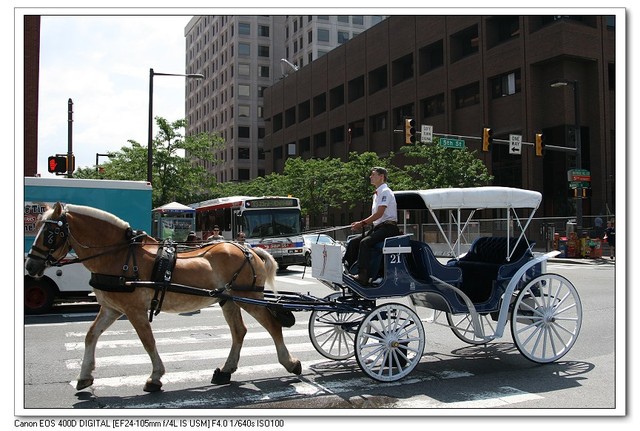 經過幾十分鐘車程後,到達了我們要參觀的第一個城市-費城,費城位在賓夕法尼亞州,美國獨立戰爭期間,費城是美國革命的發祥地,許多具有歷史意義的事件都發生在這裡. 從停車場走到獨立宮前,可以嗅出這城市的悠久歷史,有富蘭克林紀念館,國家鑄幣場,連路旁的地下鐵都看起來有很歷史的韻味,還有觀光馬車可以乘坐.