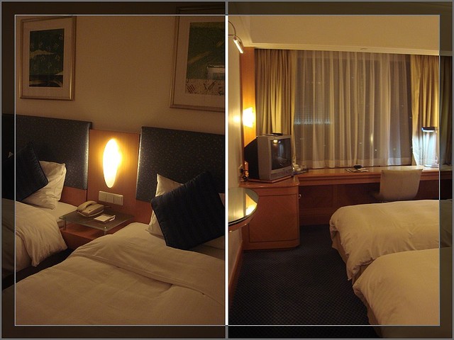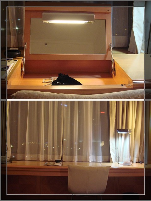 進門一看,房間好小喔! 兩張小小的單人床,靠窗戶的地方擺著一張很大張的桌子,桌子掀起來有一面鏡子,抽屜裏面還擺著吹風機,房間內有插孔,可以免費上網...浴室裡沒有浴缸,只有淋浴的地方...什麼都看起來小小的...呵呵~