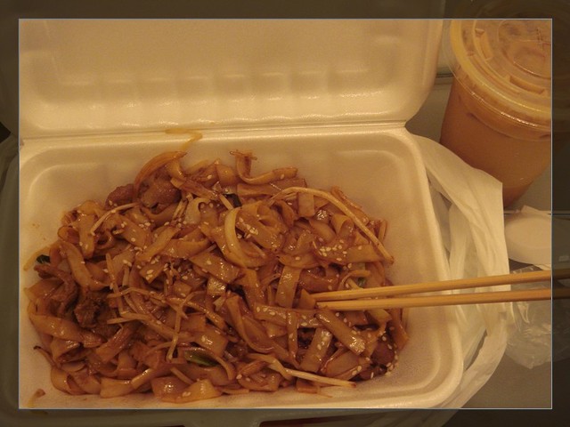 夜深了,我們沒再出門逛街,只到附近的餐廳-點心皇外帶麵食和飲料回來吃,這家店裡菜單一脫拉庫,害我看的有點快要脫窗了...點了干炒牛河和凍鴛鴦外帶,份量十足...在餐廳裡看到好多人好像在吃正餐的感覺,每樣份量都很夠...拿回飯店打開來看,很真的很大一份...我們倆個可是硬撐才把它吃完...味道還OK啦!