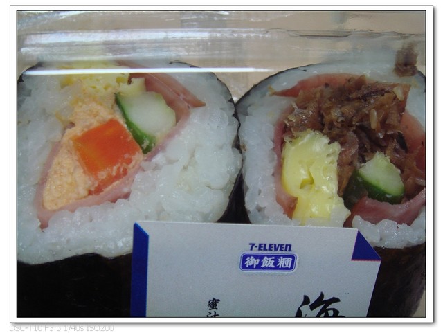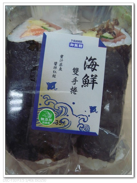 先來介紹一下我之前的最愛-海鮮雙手捲,一個包裝裡面有兩個手捲,醬拌紅鮭和蜜汁柴魚,其實我是衝著柴魚吃手捲的,火腿包著蜜汁柴魚,蛋和小黃瓜,甜甜的柴魚和手捲飯配起來非常的合,讓我有點胃口大開!不過這兩根手捲的熱量不是很低喔!總共要430大卡,等於一餐飯的熱量,所以大部分都要拿它來當正餐吃才行!