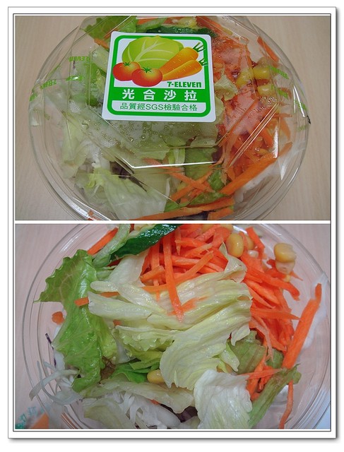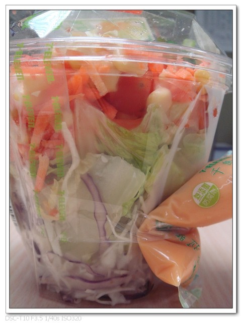最近的最愛-綜合沙拉,裡面有美生菜,高麗菜絲,紫高麗,小黃瓜,玉米,紅羅蔔絲和一顆小番茄,雖然我會把一些不愛吃的挑出來,不過整體來說還是很優,淋上附的千島沙拉醬,頓時之間這些生菜都變的非常美味,呵呵,不過要減肥的人,沙拉醬還是淋少一點比較好,不過這整個的熱量蠻低的,搭約只有150大卡而已!
