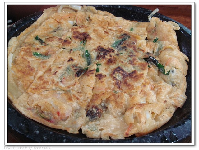 海鮮煎餅蠻大一個,用燒熱的石盤裝著,裡頭有蝦子,花枝,蚵,大蔥和紅辣椒,光聞味道就很香,沾著特製的醬油膏,還不錯吃喔!
