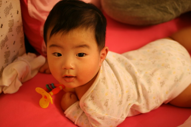 上個月醫生檢查的時候,大大翻身只能翻一半而已,而目前已經進化到可以翻身自如了,有時候不讓他翻,還會不高興呢!每次喝完奶放回床上,就會開始想要翻,但是才剛喝完奶噎...肚子一用力,天阿!!我今天剛換的床單就遭殃了,趕緊將健力架擺起來擋住他翻身的路徑,呵...看他有時候卡在健力架旁邊,真覺得好笑!!