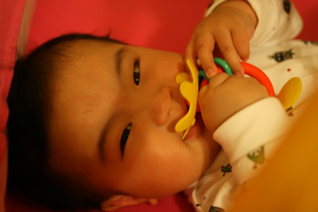 最近很喜歡拿固齒器往嘴裡塞,我也常常往他嘴裡看,是不是要冒牙了?自己也多補充鈣片,希望他可以從母奶這邊得到多點鈣質,牙牙趕快冒出來,嘻~~ 大大...媽咪很期待你長牙喔!