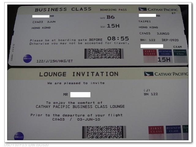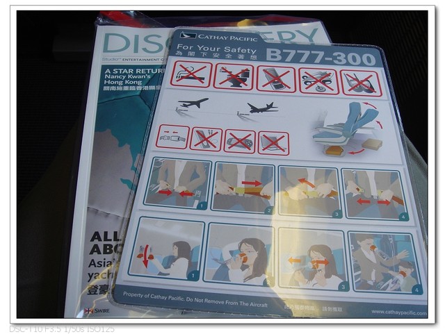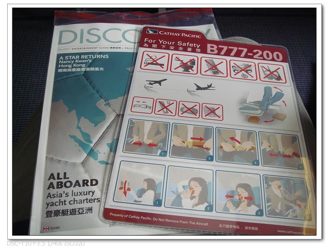 第一段航程是台北飛香港CX403 9:20起飛,國泰是用波音777-300飛這段,商務艙的座椅不大,而且這段航程的時間才一小時二十分鐘而已,所以空姐上餐的速度也很快,我們只看報紙和雜誌,連小電視都沒有拿起來呢!
