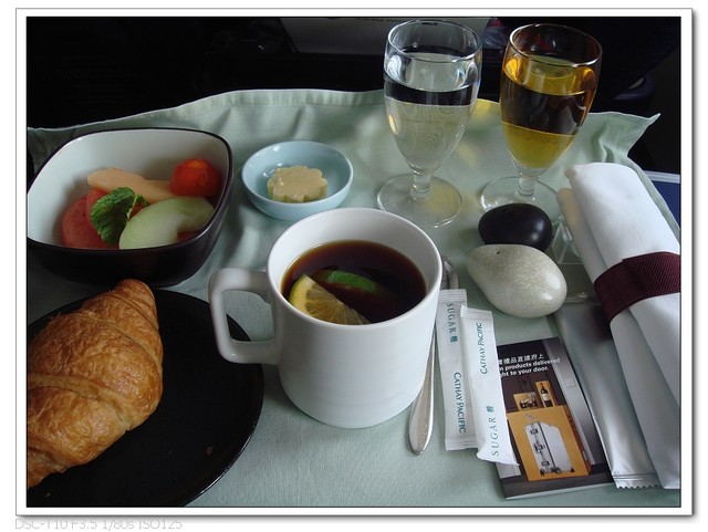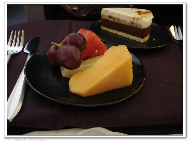 收拾好餐點後,空姐會推出甜點和水果的餐車讓我們選擇,以前明明記得飛機上的水果很甜的,結果這次國泰的水果一點都不甜,是不是從台灣的空廚出來的有關嗎?