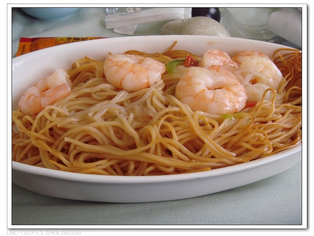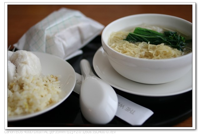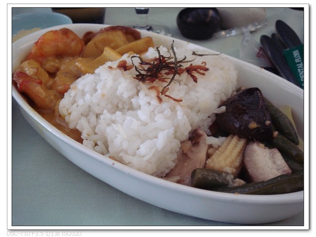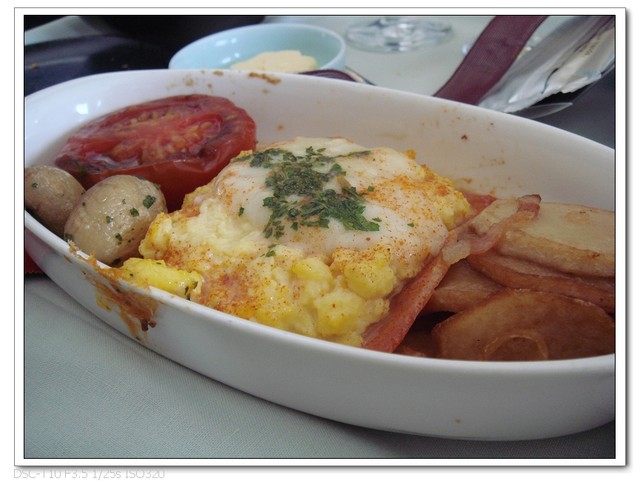 當天飛機菜單上是說著這是早餐,主餐的選擇有兩種,中式為韭黃明蝦炒麵,西式為炒蛋配火腿馬鈴薯,有好幾種麵包可以選擇,呵...他們的可頌很好吃喔!