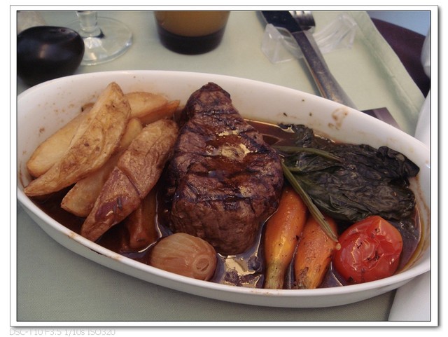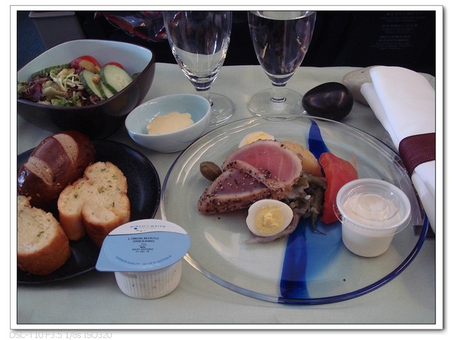 這一航段的餐點為午餐,分別有菜單和酒單,先上頭盤,有煙吞拿魚沙律,和蔬菜沙拉,當然還有烤麵包,主餐為牛排配馬鈴薯,咖哩海鮮和豆鼓炒雞柳,我們選擇牛肉和海鮮.
