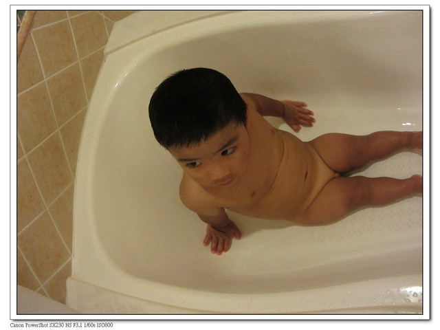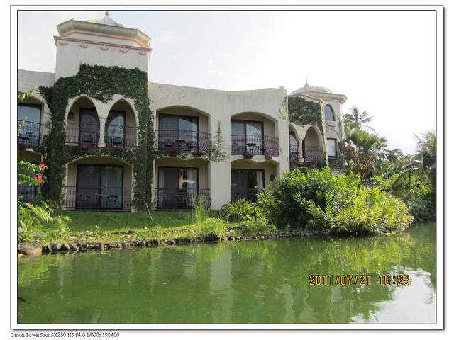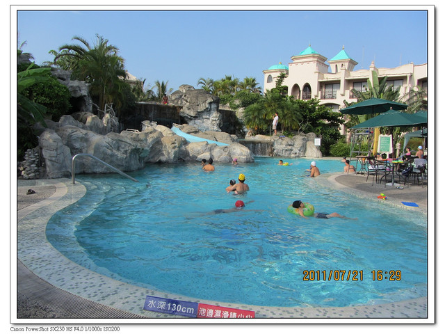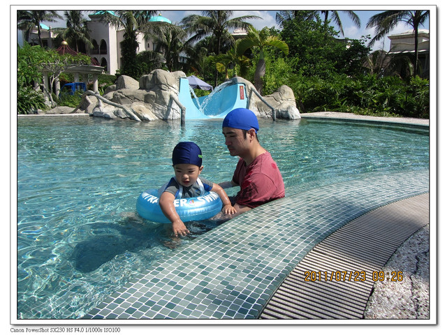 在我們住的大島附近也有個泳池,第三天早上我們就是到這裡游泳的,不過也許是因為這裡樹蔭比較少,人潮少很多,前半段只有我們一組人,呵...像似包場!! 下水時有擦曬乳,不過大大起來之後,我們才發現太陽真的太大了,沒有包到衣服的地方都被曬黑很多~~ 十足像個小黑豬(四隻黑蹄)!