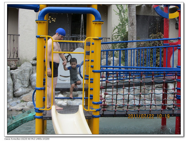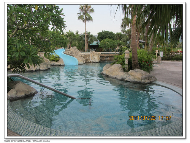 在我們住的大島附近也有個泳池,第三天早上我們就是到這裡游泳的,不過也許是因為這裡樹蔭比較少,人潮少很多,前半段只有我們一組人,呵...像似包場!! 下水時有擦曬乳,不過大大起來之後,我們才發現太陽真的太大了,沒有包到衣服的地方都被曬黑很多 十足像個小黑豬(四隻黑蹄)!