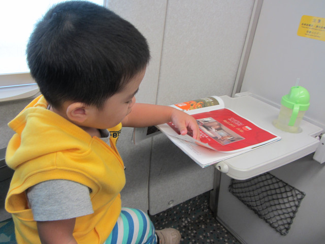 今天大概是坐高鐵以來,他最安分的一次了,帶著他心愛的小車上高鐵,先是玩車子,之後拿起高鐵的雜誌,東翻翻西翻翻,之後拉下前面的版子當書桌,跟他開始玩找東西的遊戲,要他找火車在哪裡,ㄅㄨㄅㄨ在哪裡,這小子還邊喝飲料邊看雜誌呢!最後...居然要將書上的玩具車撕下帶回,只好跟他說...爸爸會買給他~哈!