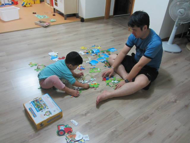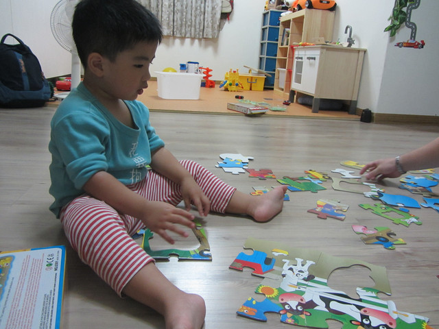 有時候是拼圖...我們一開始有買木製的拼圖,有特殊形狀,後來買了紙製品,從20片到60片,現在他自己都會說20片太簡單了...XD,這孩子真不會謙虛,但是拼60片時還是需要大人陪同,因為大大是一個很容易遇到挫折就放棄的小朋友,所以需要鼓勵和一些hint! 照片上的這一套是農場拼圖,可以拼出形狀也可以利用裏頭的小卡學英文,還不錯喔!!