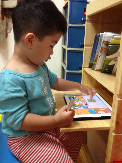 有時候是畫畫,之前給大大畫筆,他大概就只會畫圈圈,胡亂塗...但是最近給他ipad畫畫,跟他說明內容後,他已經會將圖形塗滿,算是進步了啦!