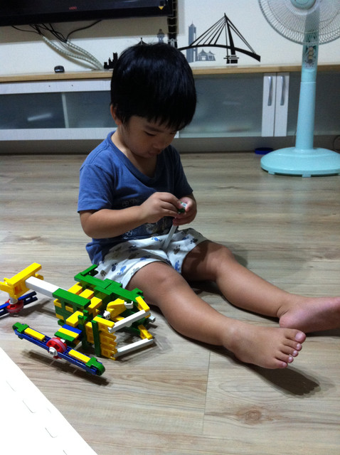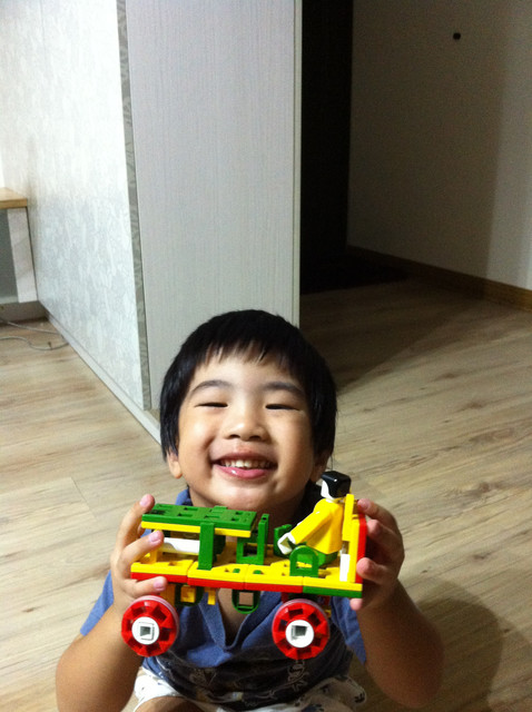 有時候是樂高,我們給他買的是基本款,舅舅送的是飛機和汽車,這樣就夠他組合出很多玩意了!