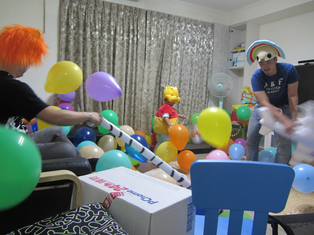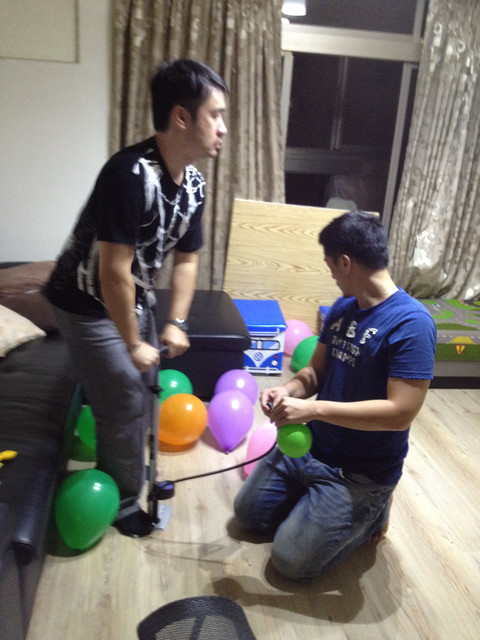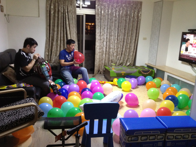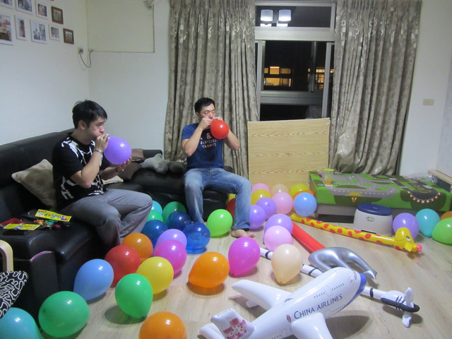 Ben和James從五點多開始就忙著灌氣球,吹氣球,好不容易才把我們家客廳給填滿,呵...真的很不容易耶,沒有氣球的打氣筒,一個個的吹~~
