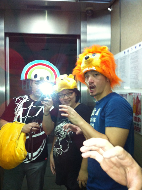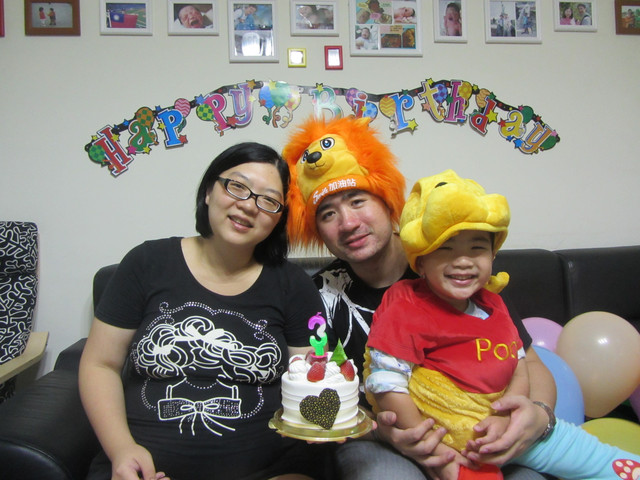 終於...吹到七點左右,該要準備出發到保母家把大大接回來嚕,不知道他本人知道今天是他生日嗎? Ben還突發奇想,要每個人戴上玩偶帽子,我想...我家管理員由監視錄影器看到電梯裡的三人,一定笑倒在管理室的!