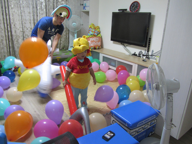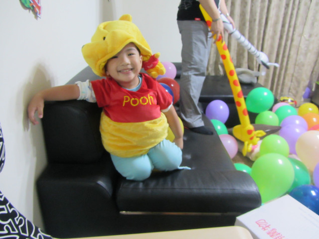 大大回到家後,穿上小熊維尼的衣服,這套衣服可是佑佑哥哥也穿過的呢!! 現在穿剛剛好...跟著爸比和叔叔玩打氣球遊戲,大大一向都愛氣球,就讓他玩個夠~~