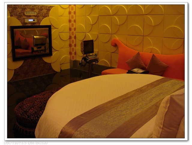 左邊是KTV坐椅,床的正前方當然是電視螢幕囉!床的兩邊有圓珠形窗簾,後面就是浴室了,