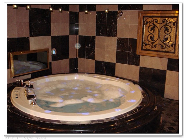 超大的浴缸...真的,這是我們遇過最大的浴缸,真希望家裡有一個...>_<,浴缸旁照例有另一個電視,Size也蠻大的喔!而且在浴缸的旁邊還有鵝型噴水,可以用強力水柱沖身體喔!很棒的設計!